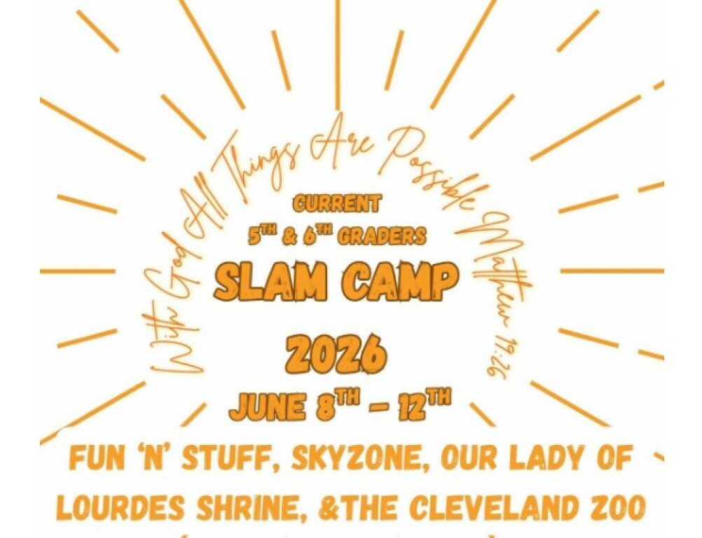 SLAM Camp is back this summer! Camp runs from Monday, June 9th - Friday, June 13 from 8:15am - 1:30pm daily. It is open to all current 5th and 6th graders. The cost of SLAM camp is $150/camper and will include a t-shirt and participation in our outings to Skyzone, Cathedral of Saint John the Evangelist, Fun'n' Stuff, and the Cleveland Metroparks Zoo! We are also in need of adult chaperones and teen counselors.